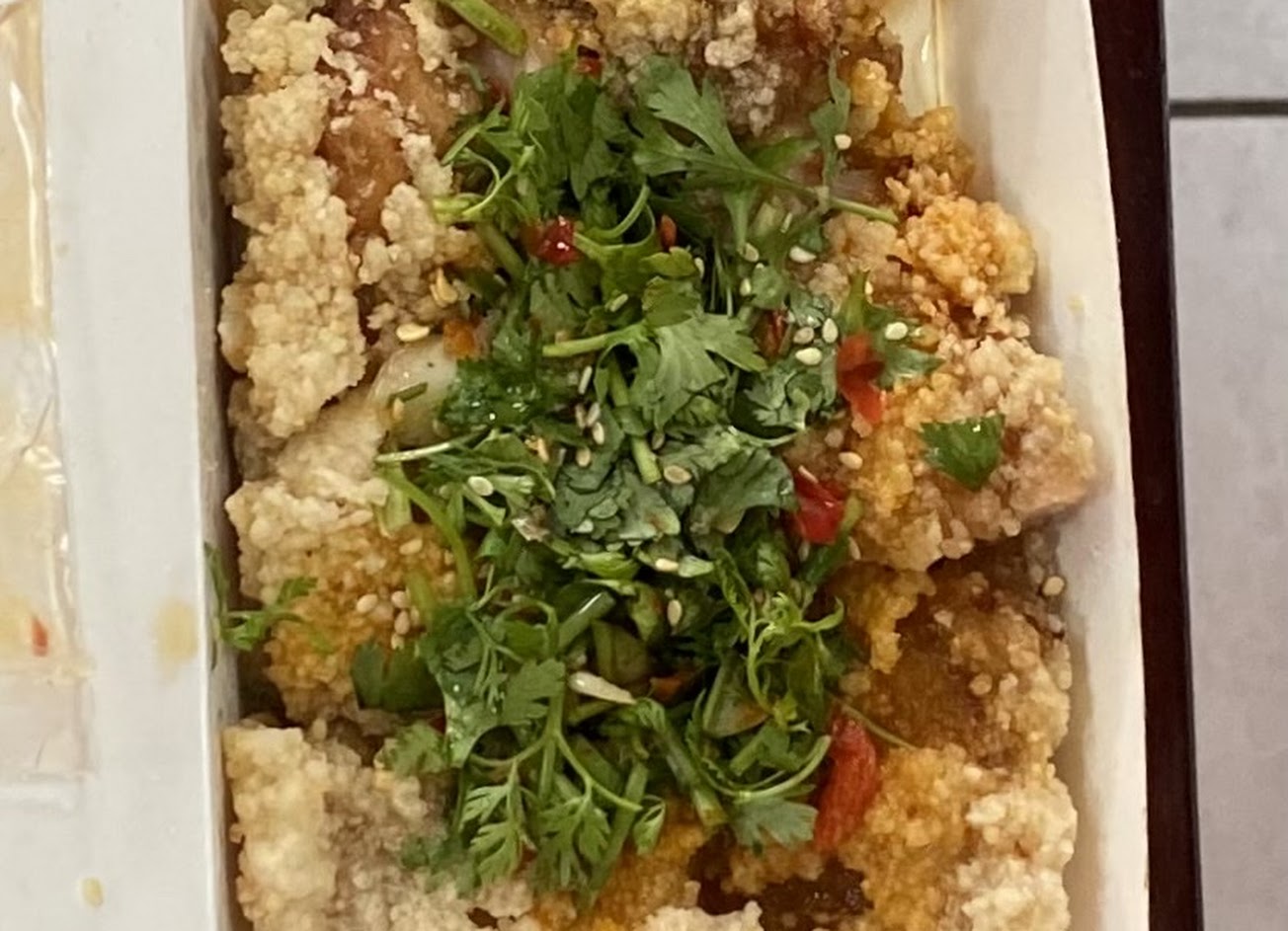招牌的椒麻雞雖然表面上很大一塊,但實際上肉量偏少,幾乎是依靠粉皮來撐起那個份量,雖然粉皮酥脆,但油脂含量偏高,會有明顯的油膩感,椒麻雞的醬汁也過於清淡,整體而言感覺比較像是吃雞排,而不是吃椒麻雞。