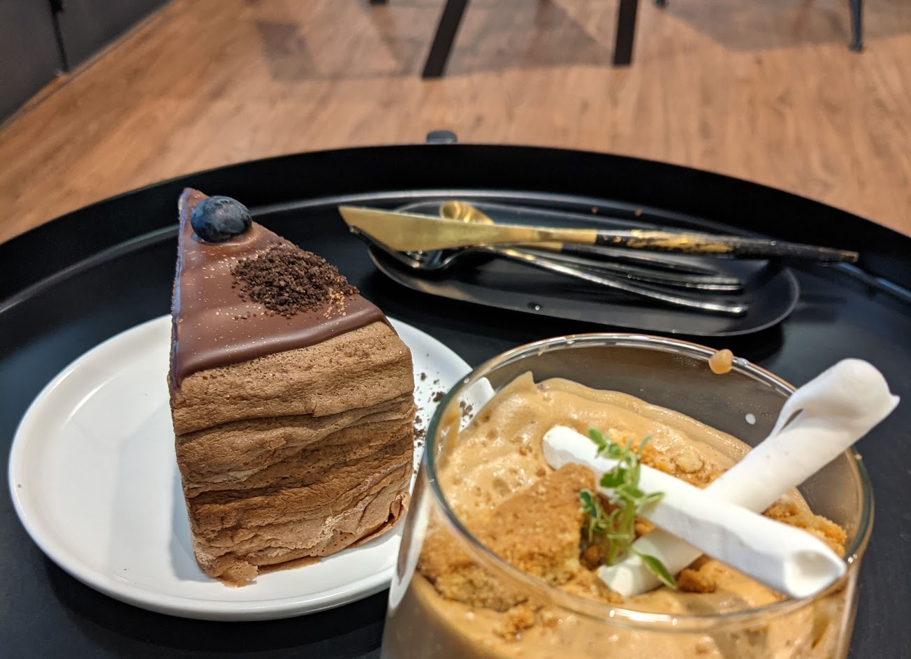 隱藏在巷子裡的甜點,店很小,需要訂位,店裡只有兩位男店員,靦腆又親切,我們兩人剛好坐在吧檯區,站在櫥窗挑選,真的選擇不出來,最後挑了千層,我與友人都點巧克力系列,甜而不膩,好喜歡!❤️裝水的容器還是酒瓶造型,好特別哈哈?熱奶茶也不會過甜,很優秀~ …
