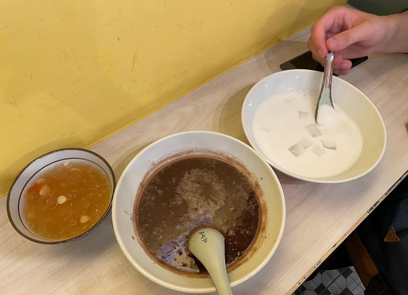 芝麻杏仁糊打得超細緻真的贏台灣9成店家 蠻濃郁香醇的(棒棒 陳皮紅豆沙很特別的口味 不愛紅豆的我都喝了好多? 是清爽系紅豆湯?超新奇的 芋頭西米露有椰奶跟紫薯兩個口味 老闆說可以綜合 除了甜品圖畫超可愛之外 還能兩個口味一次滿足超滿足的