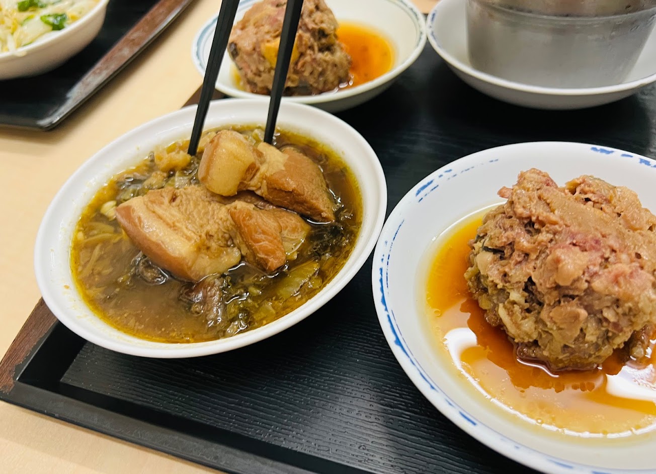 梅干燉肉非常台式,份量慷慨,鹹香油嫩,拌飯其實已飽足;搭配的當季青菜比較類似營養平衡的角色,帶來的是對自己生活在這樣富足之地的感恩。