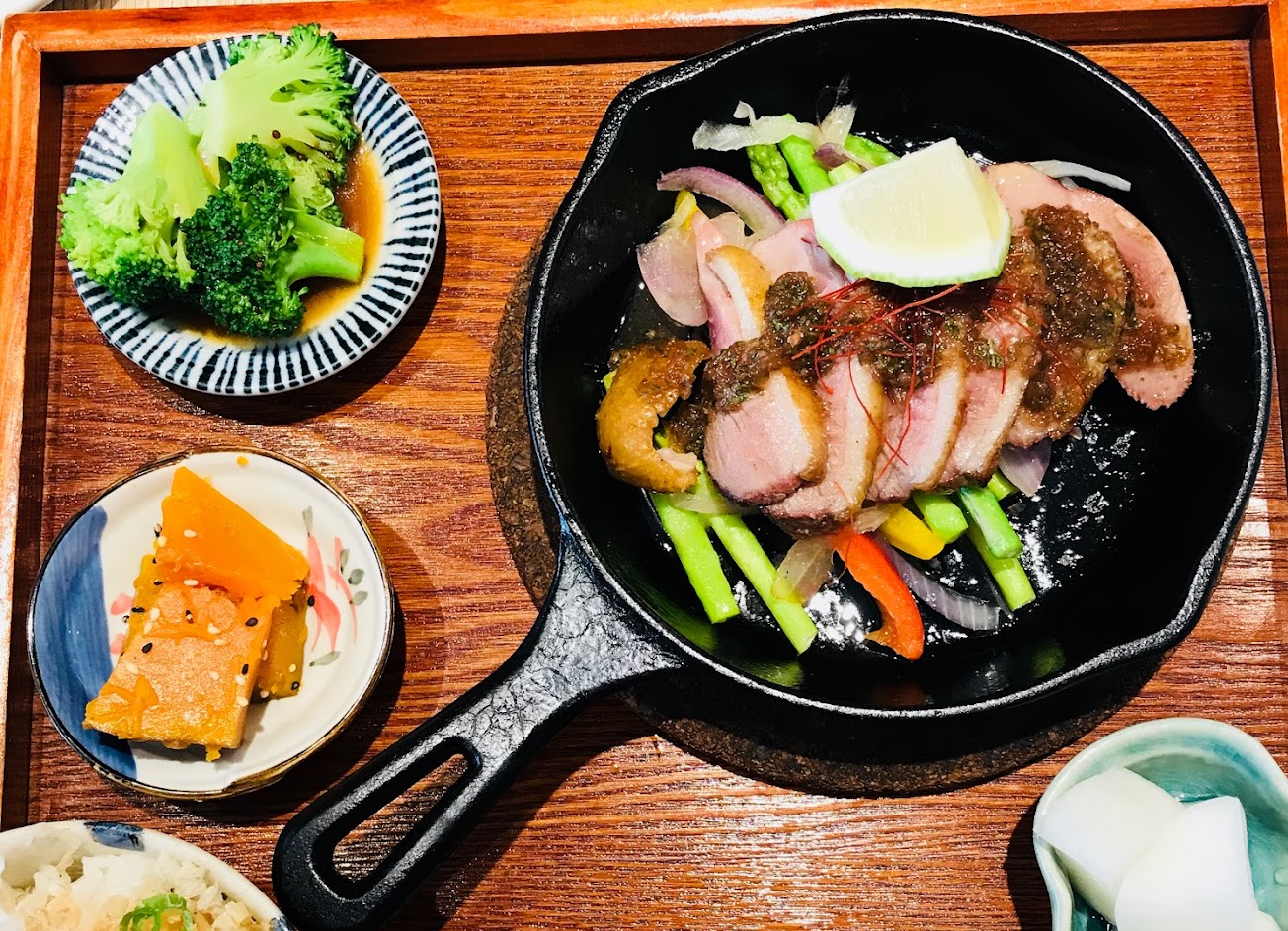 當天是吃雙人餐,小吃是炸豆腐跟旗魚串,主食的配菜部分覺得有待加強,松阪豬跟唐揚雞肉不錯吃,但套餐的飯糰我個人覺得烤的有點硬,不過很厚,飯後甜點是熱的布朗尼和炸波堤也覺得很普通,整體下來沒有令人驚艷。