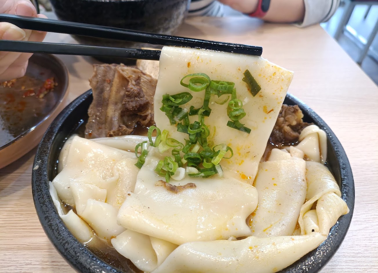 搬到新家後環境跟明亮寬敞舒適了,皮帶麺條Q彈有嚼勁,牛肉湯頭也好喝,帶鍋巴皮的煎餃也不錯,內用的話豆花自助式吃到飽,整體來說都挺好的!