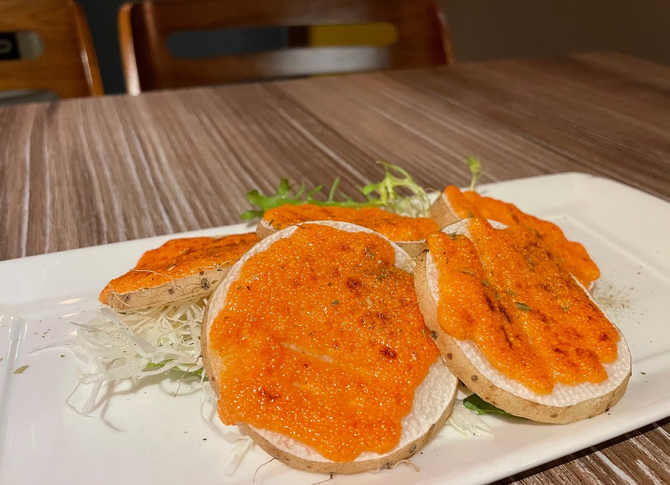 烤明太子飯糰外皮脆,明太子溼嫩,調味恰到好處,不會過鹹
