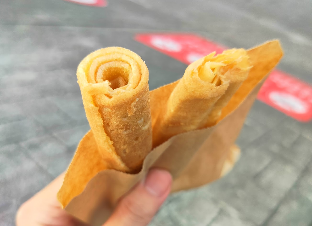 凍漲45年的古早味銅板美食,捲起來的餅皮帶有些許厚度,口感厚實Q軟,放涼後會更有嚼勁,一口咬下吃得到淡淡的蛋香、麵香以及甜味,簡單的好滋味。