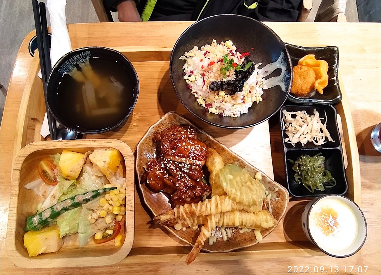 食物好吃,炸蝦面衣應該有稍微調味過的不是一般便當店的純麵粉,牛肉當天是炙燒很嫩好吃,雞肉是炭烤的,但是烤醬有點塗太多了,但主食的肉類份量偏少,米飯是香軟Q的,不會有米飯煮好放很久的臭味!很好! 當天的沙拉算是很新鮮,沾醬應該是隨機出的,百香果沙拉醬,另外一個是柚香和風醬。