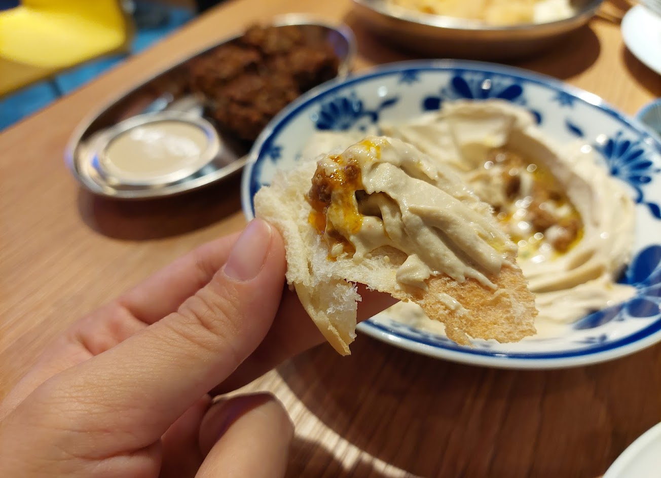 老闆很親切會跑來用中文跟你聊天 鷹嘴豆泥超級好吃是很綿滑細膩的口感 芝麻醬也非臺灣傳統芝麻醬 整體來說非常容易接受又截然不同