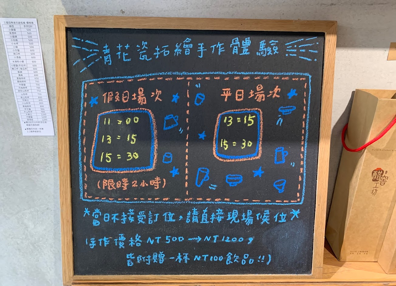 ※課程體驗: 基本上是要預約的,不過現場如果有位子的話,還是可以直接報名 在操作之前,老師會講解,這邊就大概注意聽一下 因為會應用一些小技巧 整個操作過程大概是2個小時左右,但我們有超時(笑) 如果有做青花瓷的話,消費可以抵100塊的飲料費 做完不是馬上就可以拿到,還要等45天 可以選擇自取或是寄送,寄送運費自理