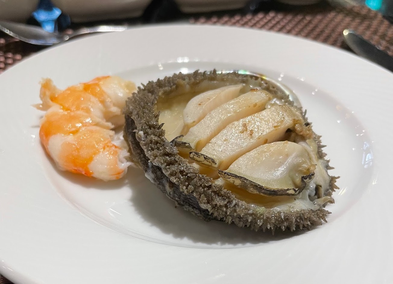 我們六人都點了C套餐,一人$2,780 (只收現金)。總共有:前菜(堅果+水果)、生魚片(兩片)、大干貝(一粒)、甜蝦(兩隻)、櫻桃鴨、煎鮑魚、蒸龍膽石斑、煎鯧魚、黑鮪魚味增湯、牛肉片包鵝肝、龍蝦半隻烤海膽加飛魚卵、prime老饕牛排、炒飯。最後到點心區吃甜點加飲料(含在餐費).
