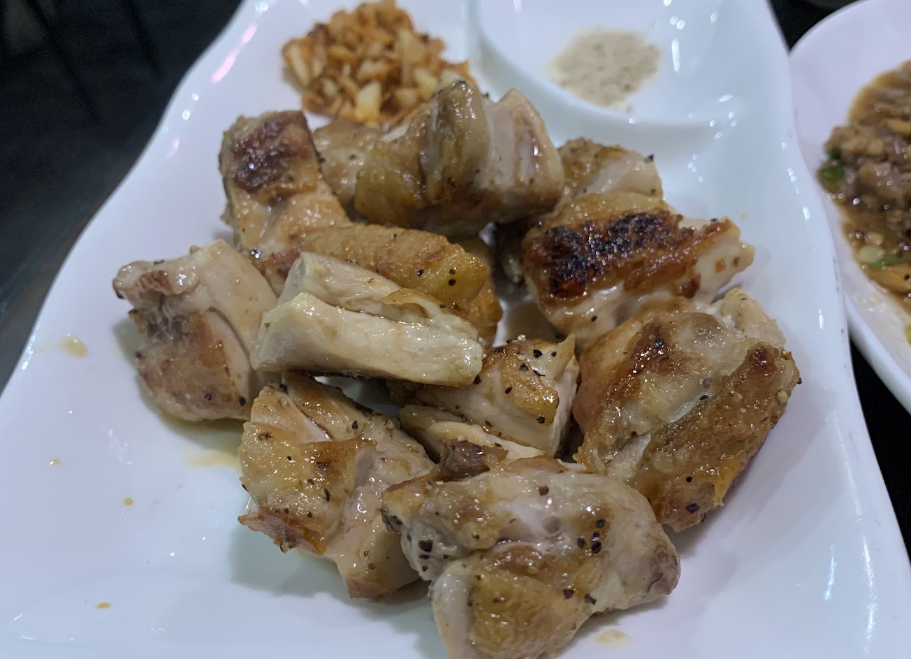 等一份牛肉跟雞排 雞排有裹粉皮吃起來蠻脆 雞肉一般~ 但牛肉味道有點噁心 就像是醃漬過久的牛肉一樣讓人吃不大下去 每一道菜幾乎都很油 不太敢吃 店家雖然很熱情招呼但是用餐時候讓人感覺很緊湊、 (很快就上甜點) 讓人吃起來壓力很大 除了停車方便之外 其它都水準下