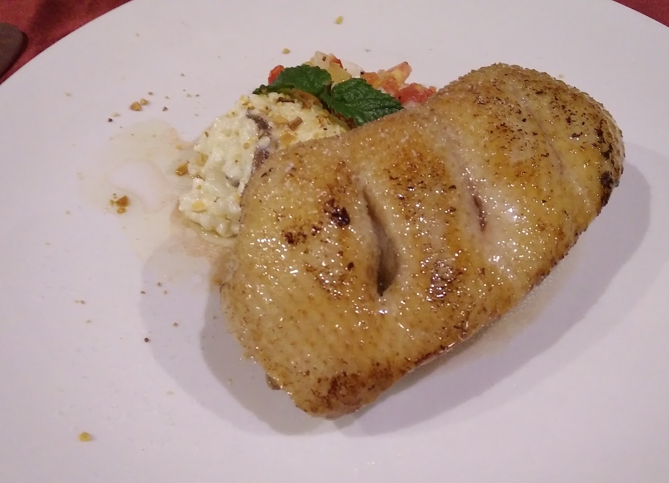 主菜櫻桃鴨上桌時皮的油緩緩留下,像是我的口水一樣,肉質紮實有嚼勁,皮很厚,肉和皮的雙重口感,不過減肥者皮可斟酌取用。配餐燉飯有濃郁香氣,蠻喜歡這味道。