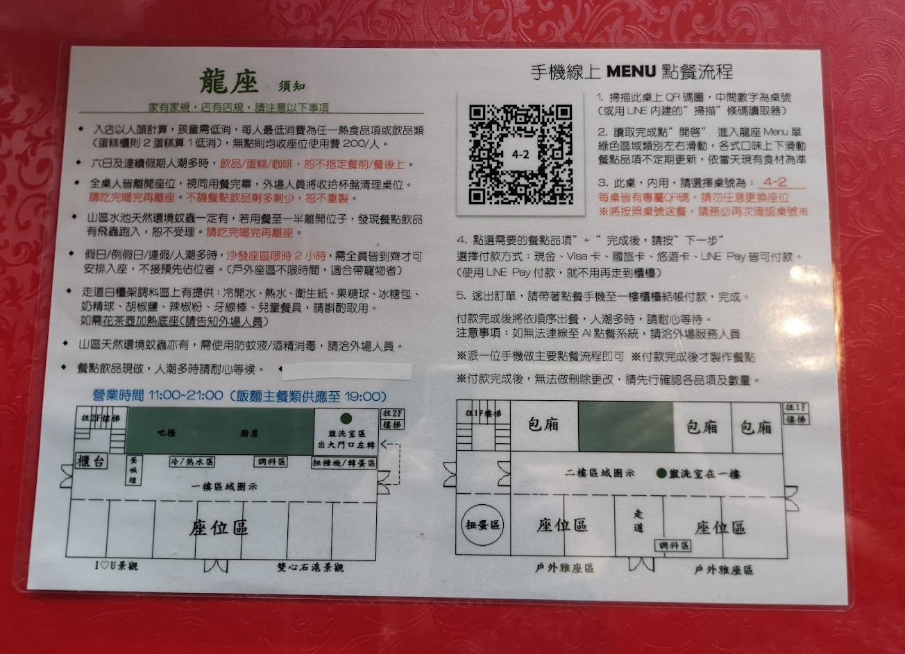 今天天氣有點(陰綿綿).下著(毛毛細雨)!!!我帶著我(老婆).(女兒)一家三口.特別從(臺北)開車來到此!!!….(((龍座珈啡餐廳)))!!!…..原本是想……來.好好享受這餐廳的(中餐)和(下午茶)!!!順便再來消費一下!!!…..因為之前…..我是看(網)!!!才得知這家珈啡.餐廳!!!…..本以為這家餐廳….應該是很(高級)的!!!…..應該是(高消費)的人來!!!應該是(經濟水平之上)的人來!!!…..但一進門後!!!一看原來只是一般般裝潢…..餐館也是一般消費!!!…..有人來招呼我們一下!!!順便叫我們自己要去(掃QR冦)點餐!!!然後在到(櫃台上)自己去買單!!!…..這是什麼情形啊!!!……難道我是來到學生時代的(泡沫紅茶店)嗎??????當下我自好自己摸摸鼻子!!!趕緊開車走人!!!………原來這只是一家(學生)水平!!!的低消珈啡店!!!……CP值不夠!!!