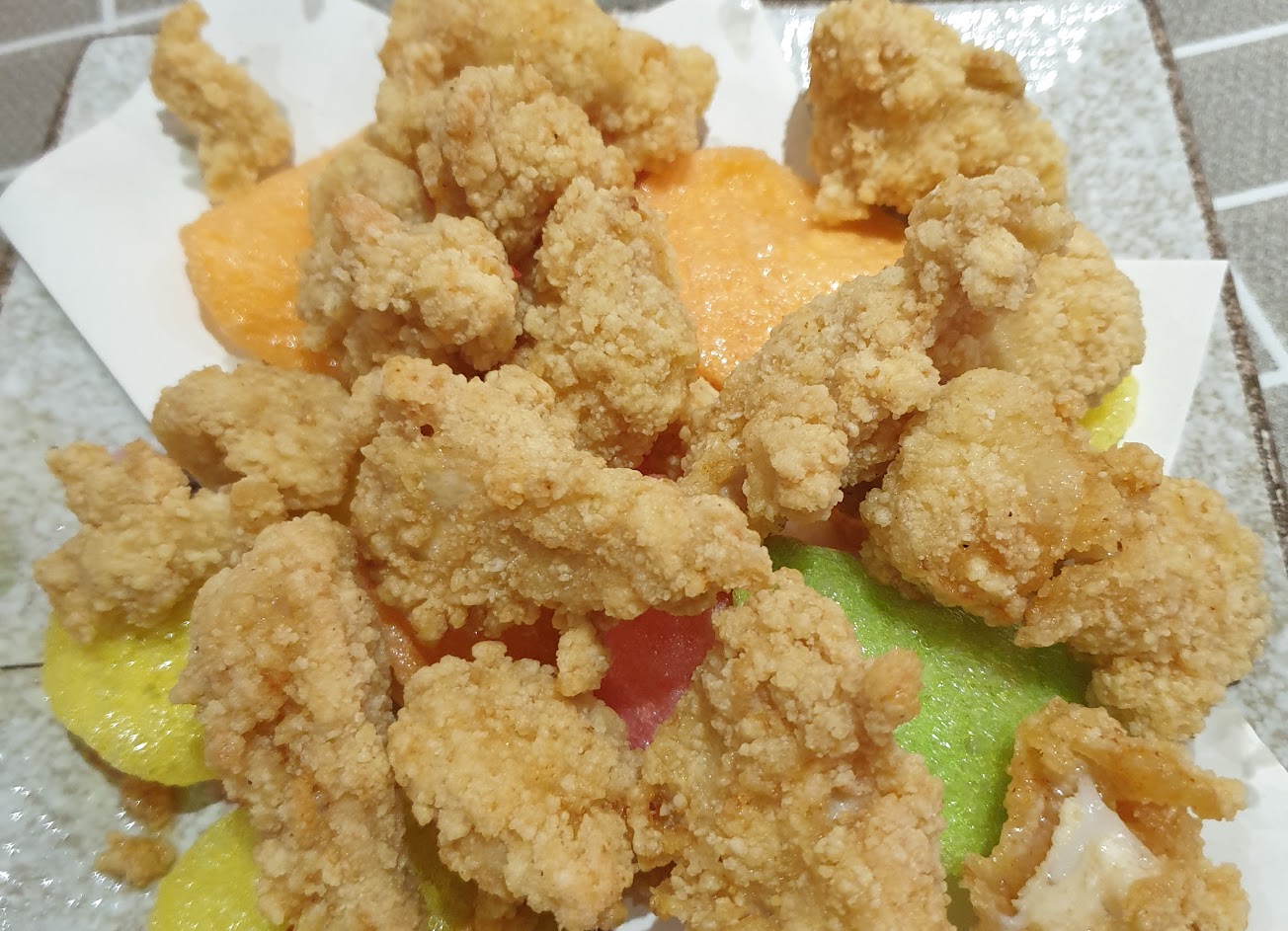 ?唐揚雞的份量多,周邊還使用許多水果點綴,而且還是使用蓮霧與火龍果!真的是下重本,意外的是跟唐揚雞一起吃居然無違和,反而有清爽的感覺~