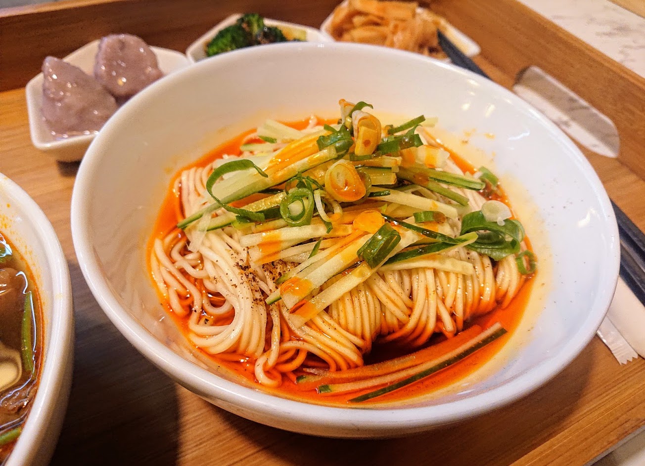 另外我們點的川味牛肉湯搭紅油拌麵,牛肉軟嫩,湯頭OK,花椒味不重。紅油一開始有點嗆辣,吃到後面會散發甜味。
