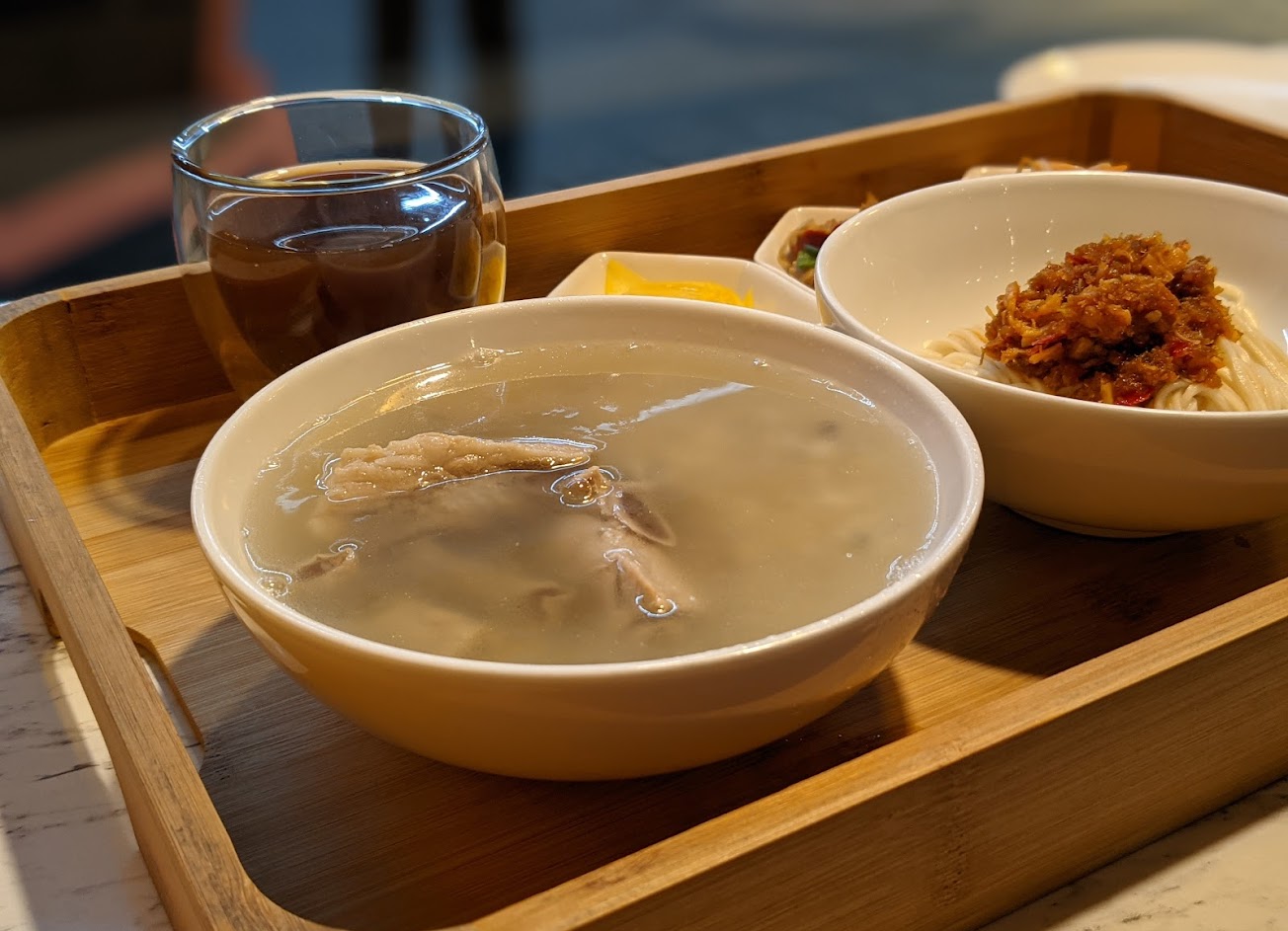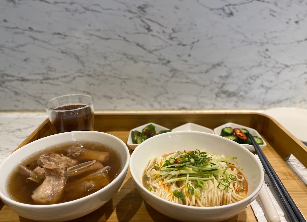 食材用得相當好,主餐是點肉骨茶,湯頭清爽卻不失豐富,非常推薦!拌麵的配料給得很多疊得高高的,吃很很過癮,這次點手撕干貝拌麵真香!無限量供應的酸梅湯和肉燥飯也很經典,味道很足!值得一訪!