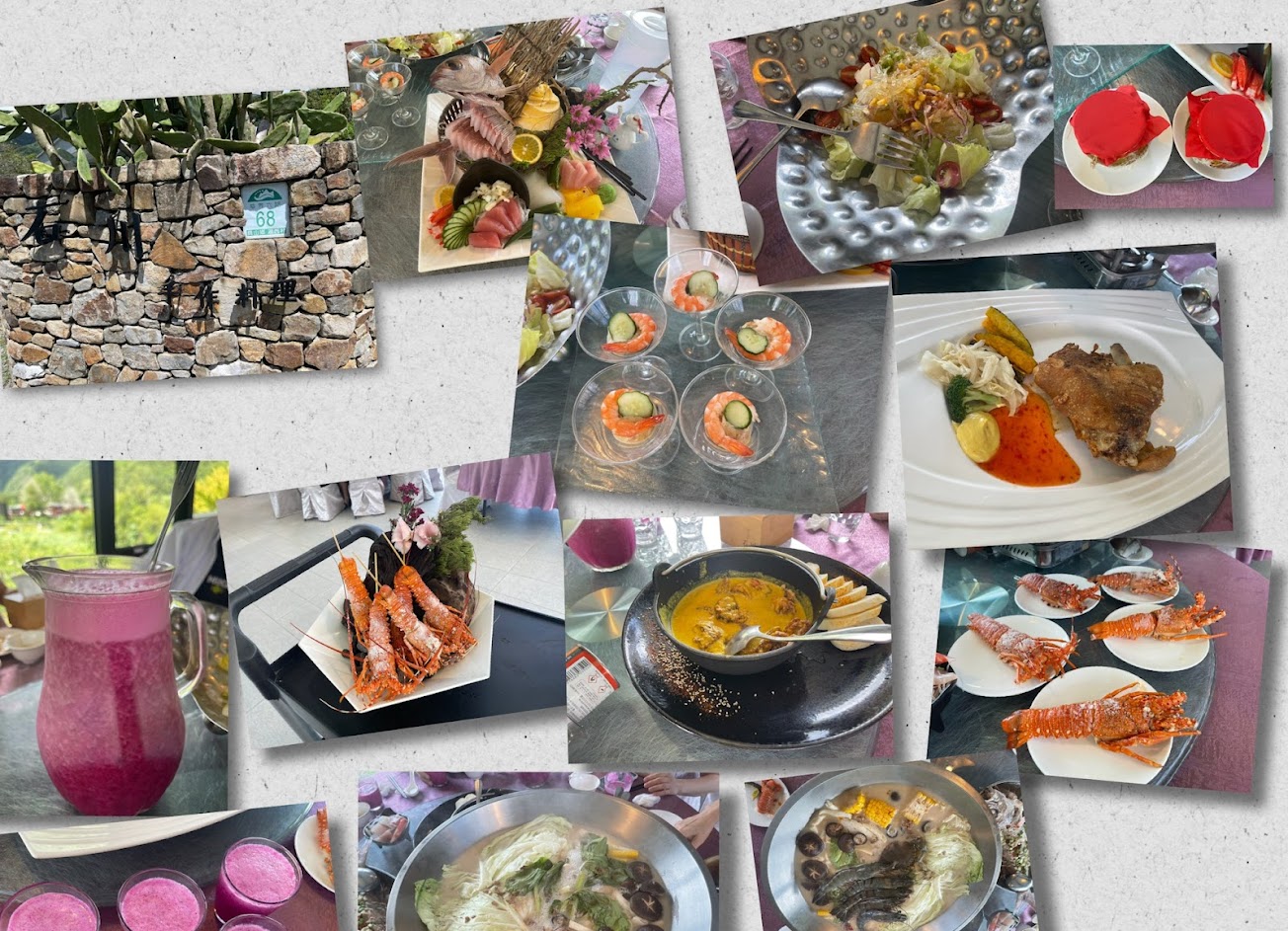 餐點好吃,每一道菜上來讓人覺得眼睛一亮忍不住多拍幾張照片,但讓我們期待的龍蝦餐點吃過後感覺失望,因為龍蝦肉質吃起來粉粉的,覺得可能是冷凍龍蝦吧!