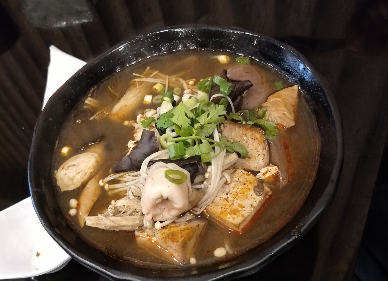 料真的超爆多!牛肉片給很多!湯頭不錯很夠味!店員服務態度很好,有朋友太辣還幫忙加原湯!麵體很好吃!是很有嚼勁的麵,但鴨血有點像假的,說不定是真的。飯量也很多~會很飽!