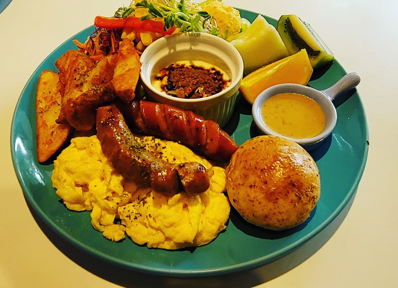 餐具、沾醬、水杯在層架上,由客人自取,早午餐組合很豐盛,還有義大利麵和咖哩飯。店狗法鬥超可愛又不怕生,客人進去就會到門口打招呼,大推-店內消費不限時,適合喜歡寵物或是有帶寵物出遊的人。