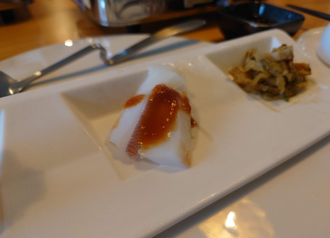 2.外層是用餛飩皮那種的麵皮裡面包著一塊蛋豆腐鑲肉,酥脆的口感沒有過多調味,主要是以外面淋上的醬汁,醬汁基底偏柴魚醬油搭味醂,如果是蛋豆腐用這個醬汁煨煮再包起來炸,味道會更融合。