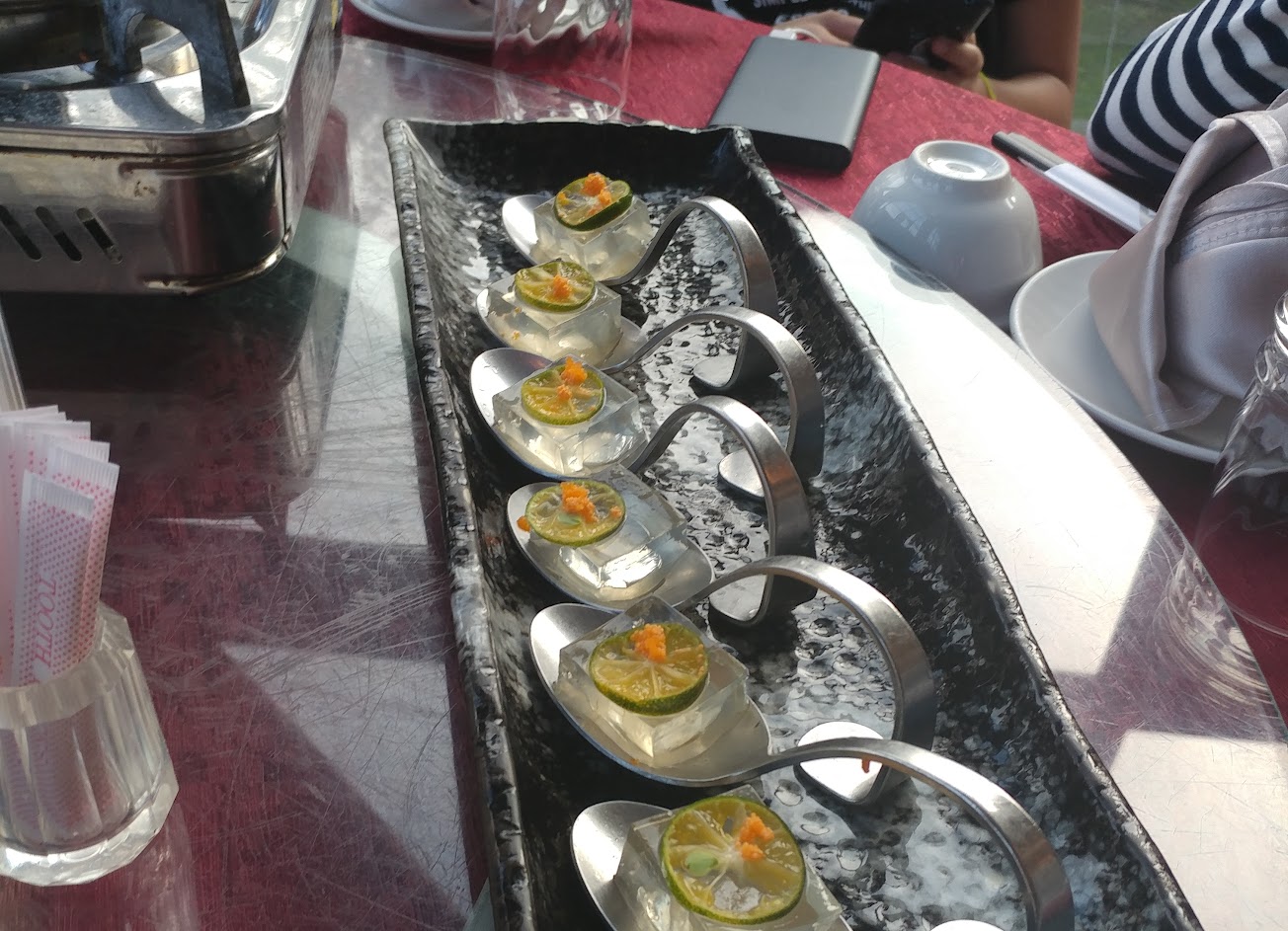 第一道生菜沙拉醬汁很省吃得到菜的原味,第二道芝麻凍薄薄的也沒幫忙劃分,第三道生魚片還可以,第四道牛奶鍋兩個螃蟹跟火鍋料沒了,第五道豬肉乾貝飯,泡水過度無味的假幹貝放在上面不知意義在哪然後飯黏成一團,第六道生蠔腥味明顯,第七道德國豬腳?原本以為焦脆的外皮已非常軟嫩泡菜一小盤9人用,第八道焗烤半龍蝦的味道還可以,下面以為是茶碗蒸結果味道卻是白煮蛋,第9道吻仔魚蒸肉?也是無味,第十道生魚片另一半用來蒸的鱸魚?吃飽了沒什麼吃,想要健身的人建議來應徵,因為菜盤又大又重真是辛苦了,然後整 …