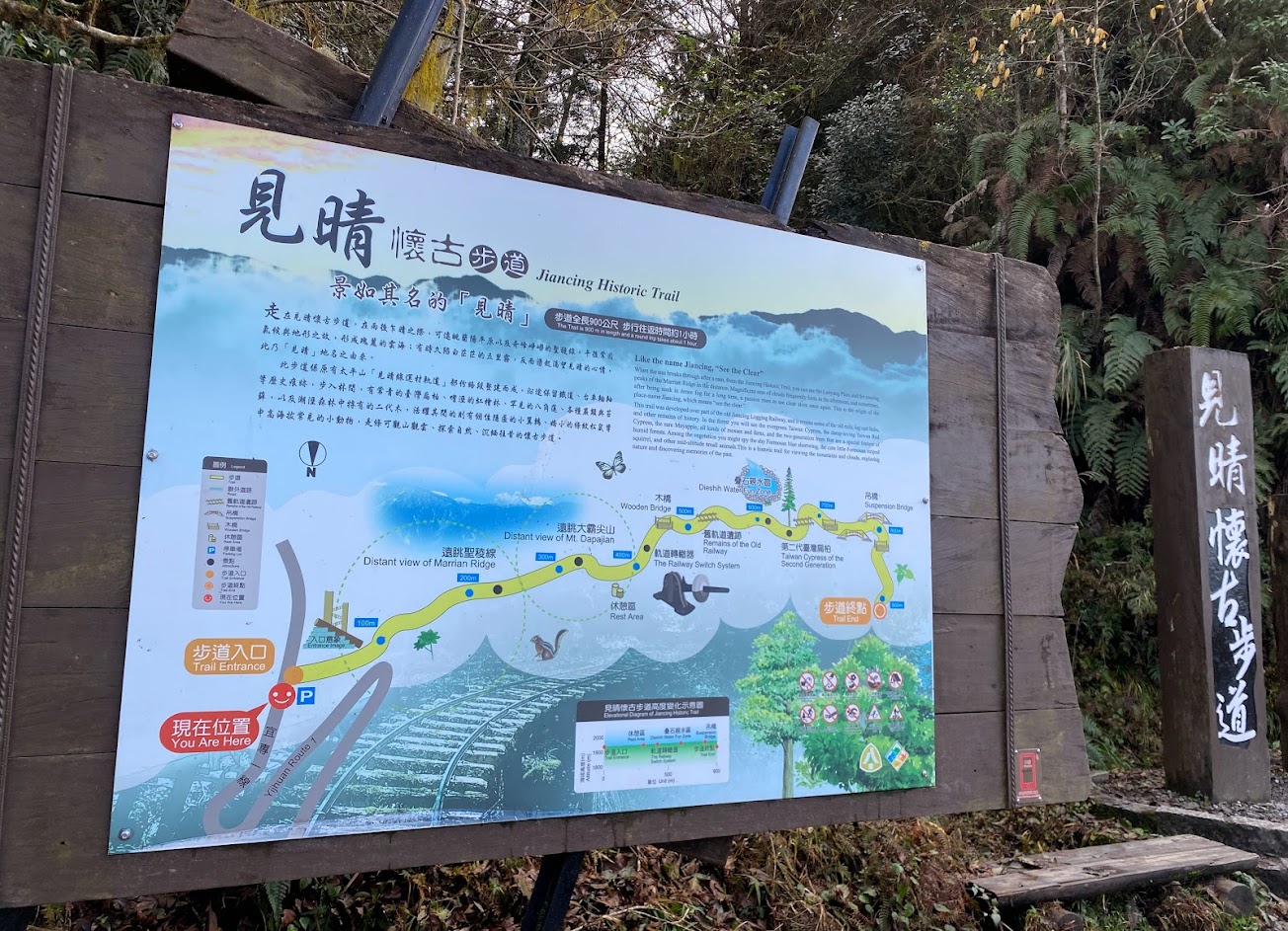 早期運送木材的鐵道因為風災損害,目前僅存900m,沿著鐵道在森林中漫步,一會兒雲霧繚繞,一會兒霧氣散去陽光灑進來步道上,沒有高低起伏的坡度走起來非常舒服,唯一缺點就是停車場距離步道口1.3K, 停車場有親子廁所 剛整修完成,希望使用者能夠儘量維護。