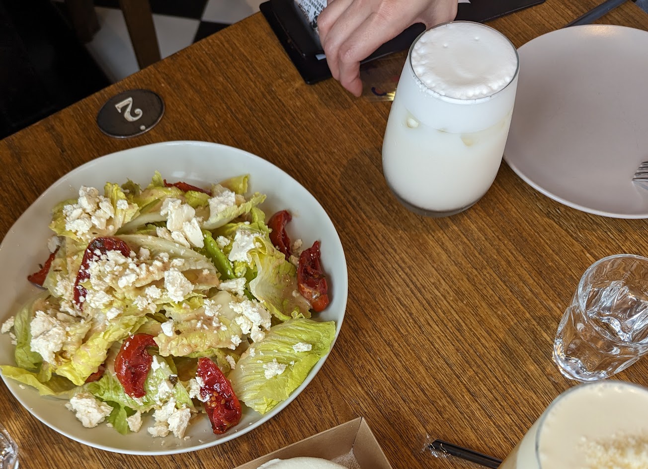 來第二次了,麵包蛋糕也回購很多次了!甜點麵包跟餐點幾乎無雷全部都推,且內部裝潢很漂亮,挑高設計加大片落地窗讓採光跟空間感十足。這次內用點了吻仔魚披薩真的超好吃啊啊啊!這裡的吻仔魚又嫩又鮮甜,沒有一般乾貨吻仔魚的鹹腥味,且灑了超多在披薩上面,配上柴魚片跟美乃滋讓普通的章魚燒口味完全跳脫出來!加上這裡的麵包原本就是很好吃的,讓這個披薩變得更加完美了!內用必點! 每一道料理的起司都不同,讓人感受到餐點設計上的用心。沙拉裡的起司就屬硬質起司,較鹹微微臭,配上番茄乾跟生菜很搭,不過量蠻多的,起司吃到最後會有點鹹。 這裡的奶蓋飲料既漂亮又好喝!也是必點!最濃郁的起司奶蓋就在這裡了吧!喝一口覺的超幸福的~ 要離開時再順手帶一顆招牌爆漿乳酪麵包結束這回合~~