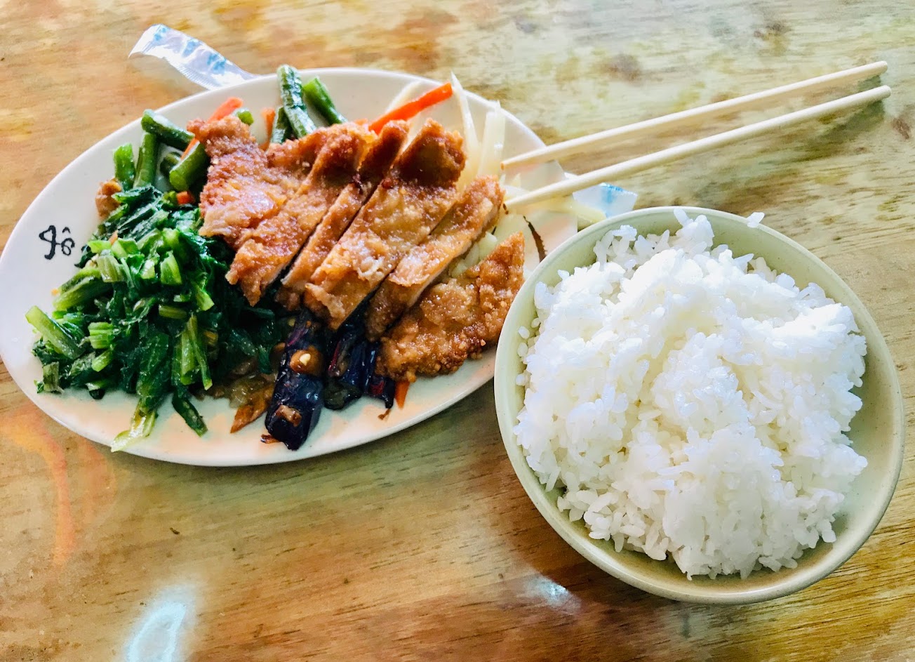 (照片中:炒A菜、炒豆子、炒茄子、炒筍絲、炸排骨、大碗白飯$75,便宜到爆!)