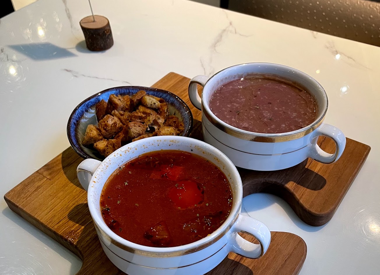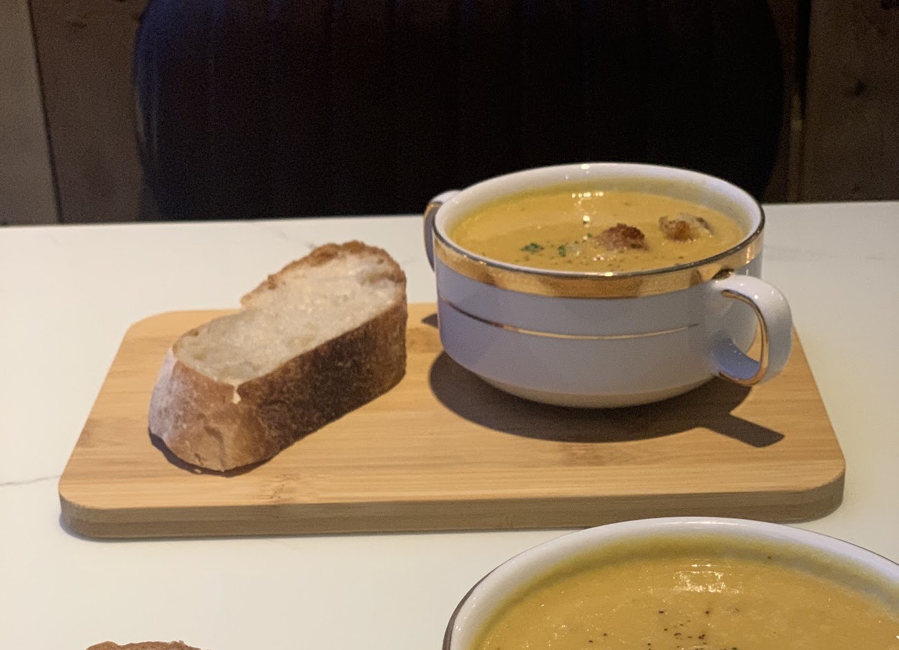 沙拉新鮮,搭配的麵包丁和一般不同,很香很好吃;