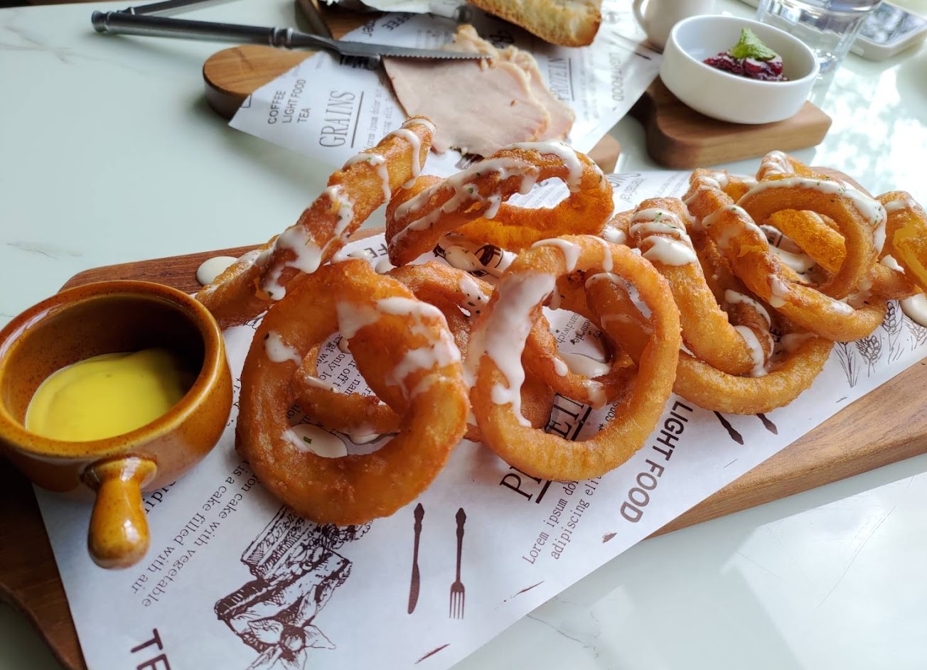1️⃣桌子太小了,用餐當天我坐兩人座位,點了一杯美式、一壺水果茶、一份披薩、一份西班牙烘蛋、一份綜合麵包盤,桌子上滿到手都沒地方擺,建議店家可以將餐盤換小一點,我們那天好怕水杯會不小心掉到地上啊