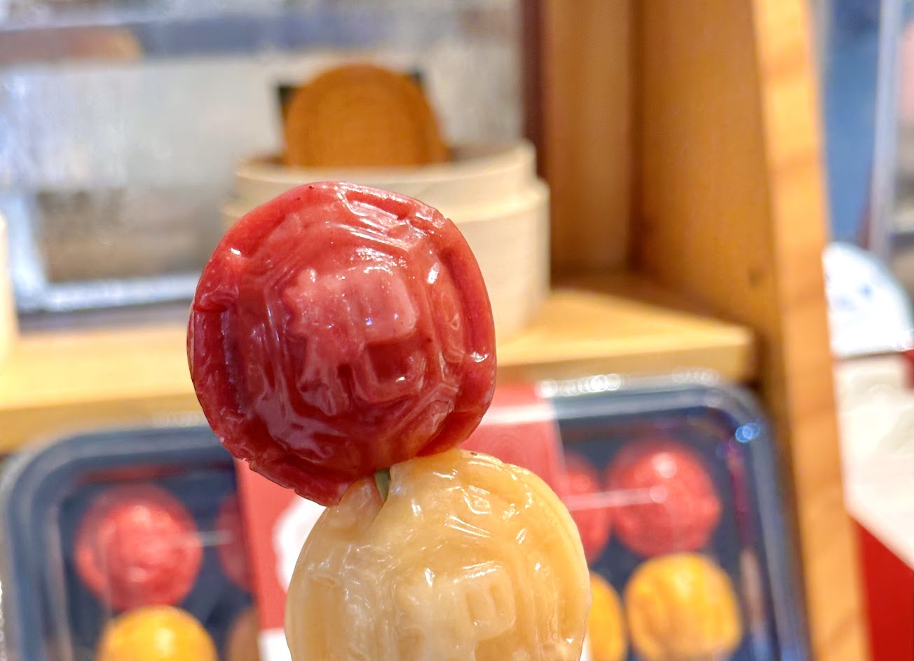 迷你版紅龜粿,口感較硬,差不多50元硬幣大,3個1串原價80元,打卡優惠為60元真貴啊!