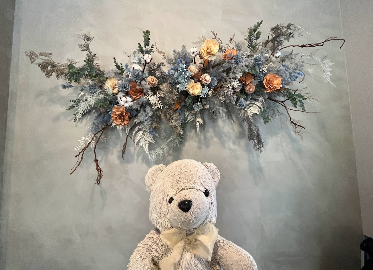 吧台桌座位可以看著店家優雅的準備出餐,清水模的牆面加上局部莫蘭迪蘭的牆面搭配一系列莫蘭迪色系列的花牆設計,整體沈靜舒服!