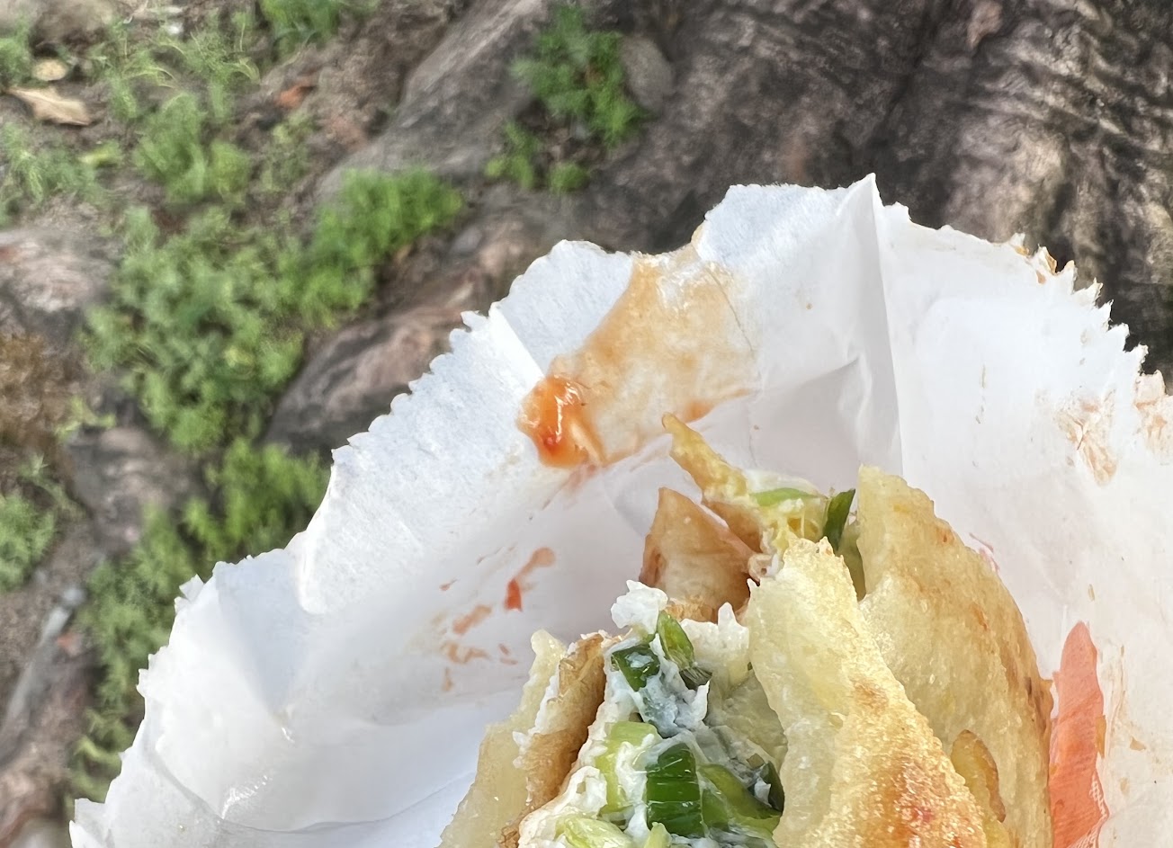 選了甜辣醬,超燙~ 半月形,蔥跟蛋被夾在中間 沒咬到蛋的時候脆脆的麵糰好香 接著再配上蔥跟蛋~喜歡