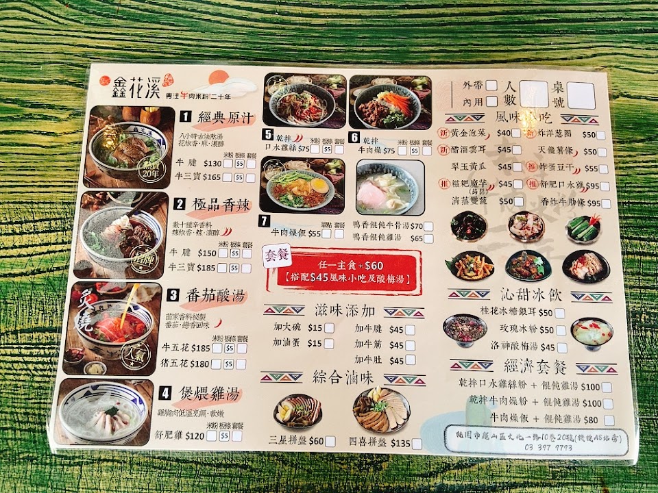 湯頭主打紅燒及餛飩雞湯 紅燒有些許麻及辣味, 若欲提升麻辣度,可加花椒粉及辣椒粉 搭配的麵食是粗米粉 乾拌類的口感搭配較為適合 湯類搭配米粉就相對一般