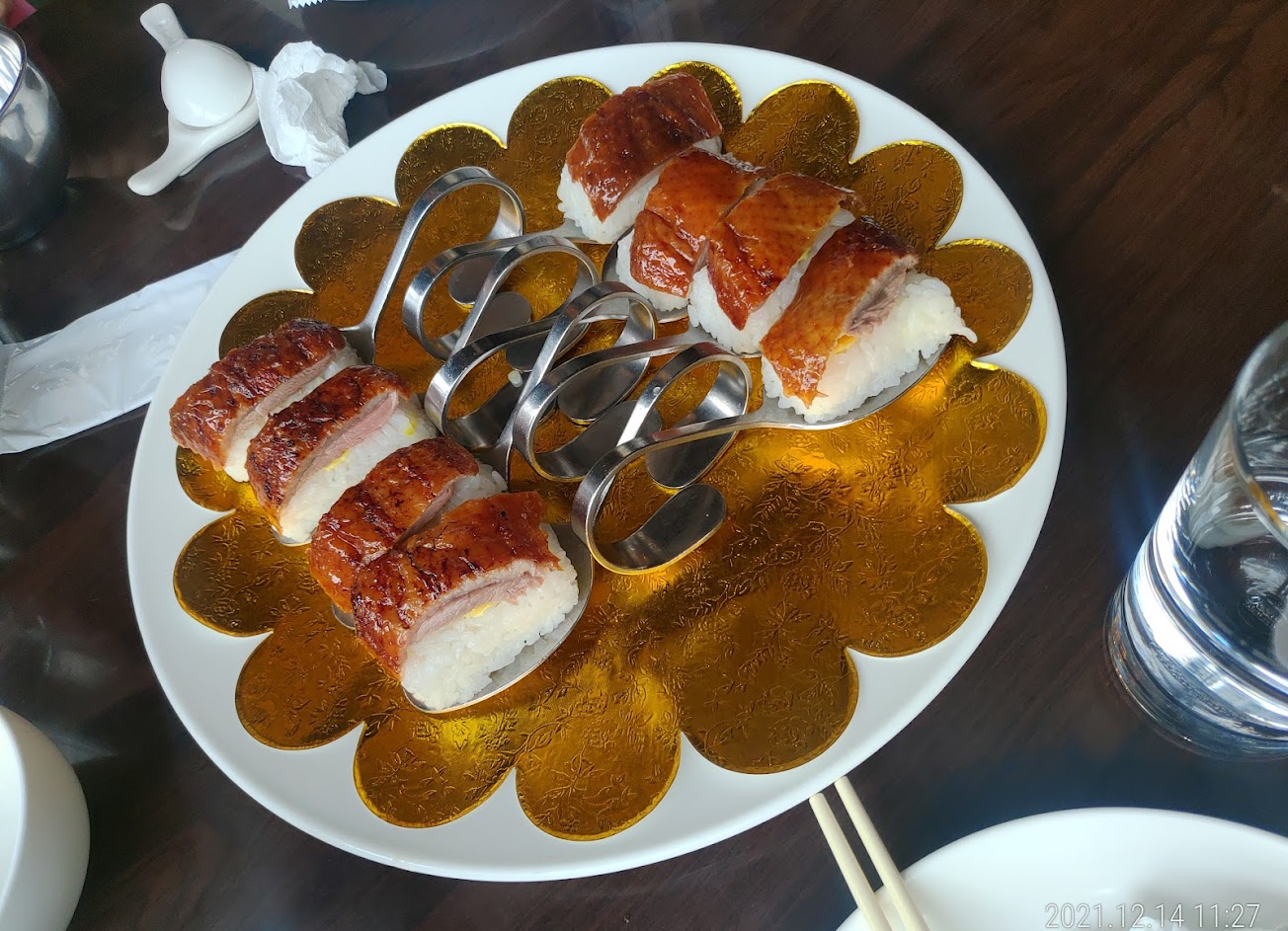 餐點上桌還有桌布服務,廚師會抓一隻烤鴨在旁現切,旁邊小姐會擺盤介紹送上桌。感覺就好像上流社會人士去吃高級餐廳一樣(虛榮感爆炸啦?)