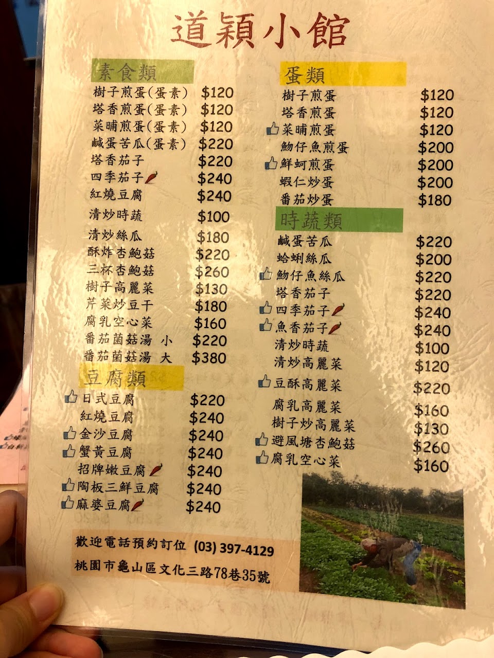 道穎小館是個小餐廳,美有華麗招牌,是個不顯眼一樓小住家,外觀沒有餐廳樣子,沒有仔細看不易發現,其環境不錯,菜色美口味佳,服務周到,還有很多特色菜,常常客滿。是林口長庚附近難得的有特色中餐小館,非常受附近人士喜愛,是宴客或聚餐的首選。前往用餐必須先預定,難得會有空位。