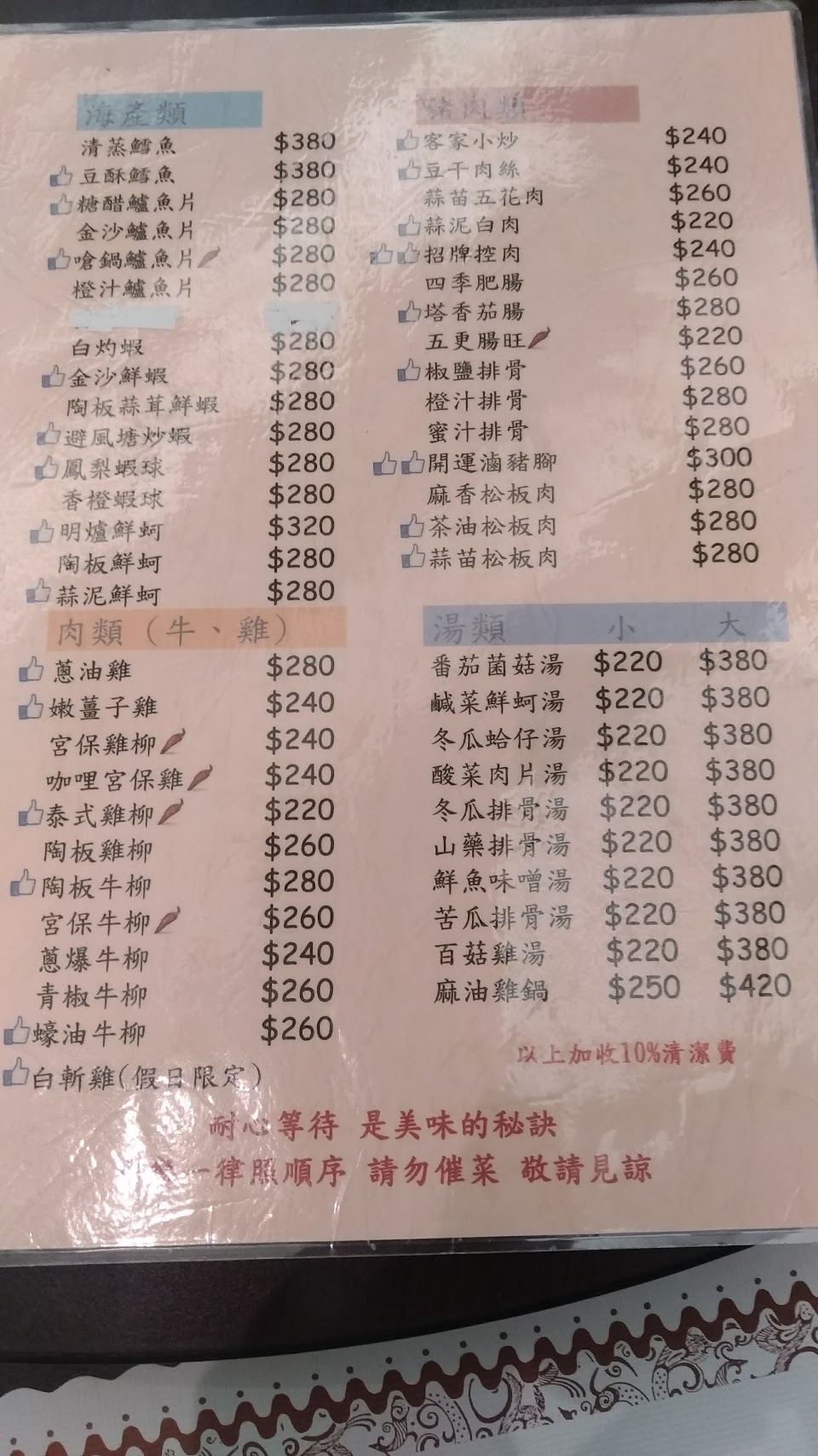 值得一嚐的餐廳,口味非常道地,推薦滷豬腳300元/份,避風塘蝦280元/份,五更腸旺,幾乎餐單前面有老闆的標示讚的大拇指圖案都可以試試。