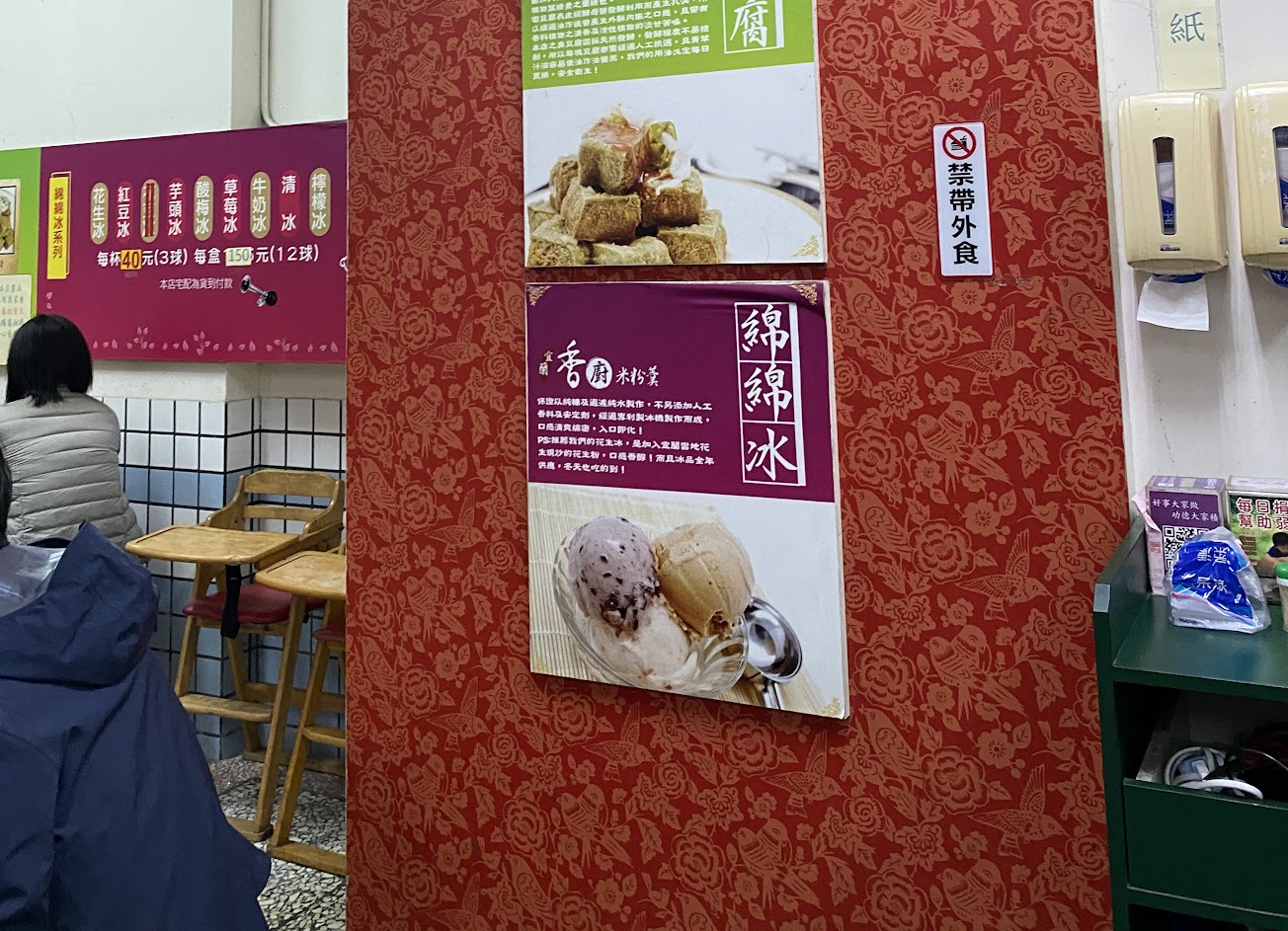 比較可惜是米粉羹是我們吃不習慣的口味,臭豆腐外酥內嫩,泡菜好吃,店內也有販售綿綿冰,一球18元,剛好吃完羹和臭豆腐可以解膩,還是喜歡清冰?