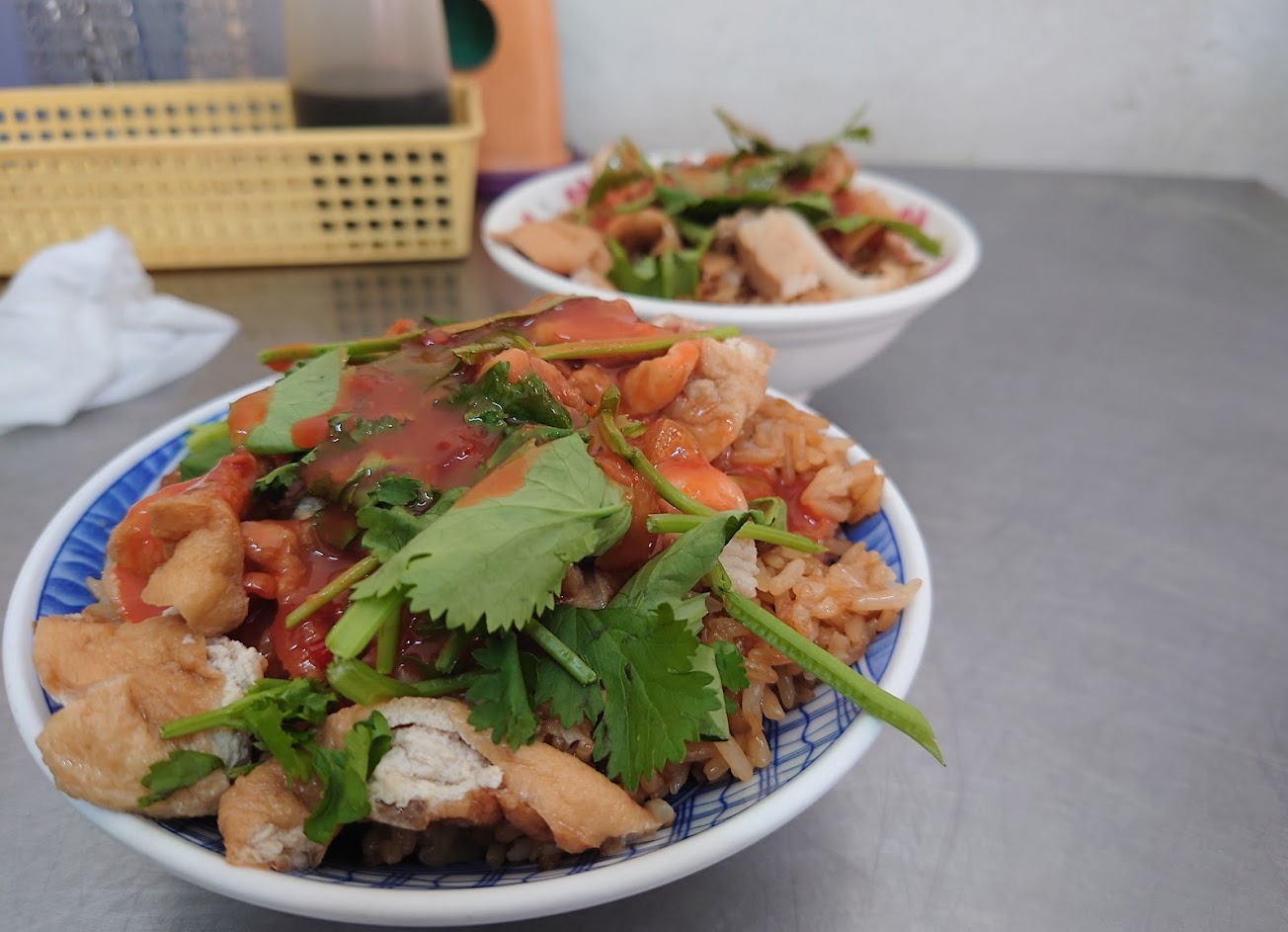 油飯鋪滿油豆皮,淋上甜辣醬,很特別的在地口味。