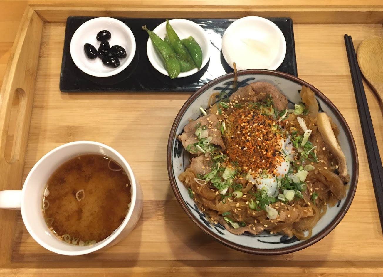 黑牛丼180元附溫泉蛋,活菌豚丼150元附溫泉蛋,都有三種小菜(有黑豆!)和一碗味噌湯一杯茶。另外+100元定食含茶碗蒸、蔬果棒、奶酪。可以吃很飽,食材都很健康,不會過鹹。