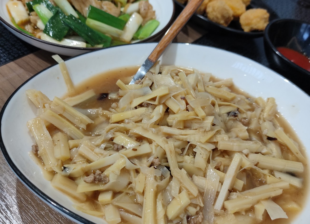 有炒筍(很入味,筍子很香甜軟嫩),糖醋排骨(骨頭比肉多,但味道可以),客家小炒(下飯不辣必點),蔥爆豬(蔥蒜很嫩,豬肉很香又不柴,很有口感),必點甜不辣(酥脆又不會太硬,冷掉也好吃),薯條普通,但小朋友很喜歡。瓜仔蒸蛋(很適合有小朋友的家長點,不會太鹹,但肉香蛋香,很好吃阿)。