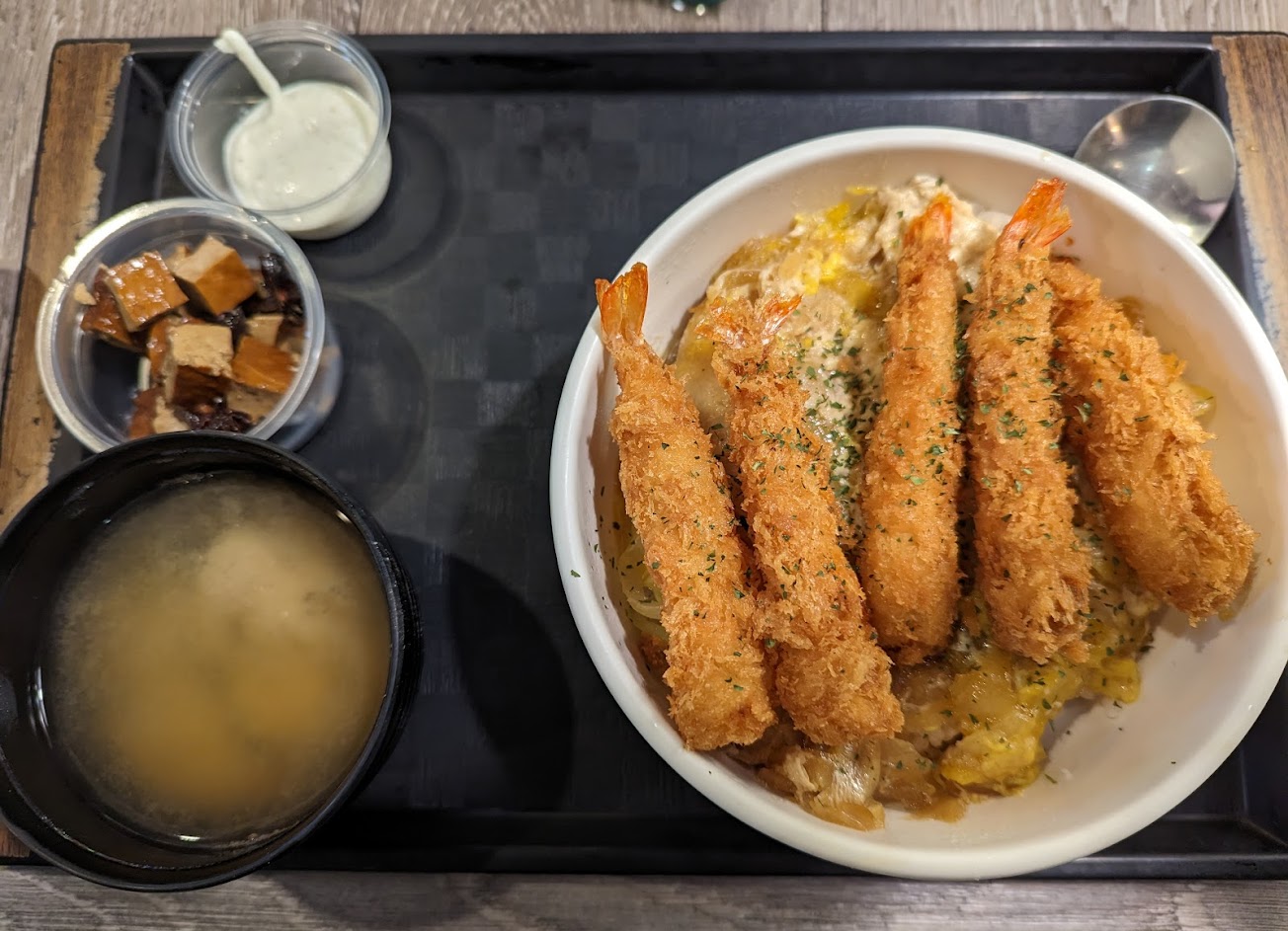 Affordable and Amazing Japanese restaurant, we ordered 2 Omelette curry rice bowls (beef and triple fry with miso soup), Curry rice bowl with shrimp tempura and clam soup