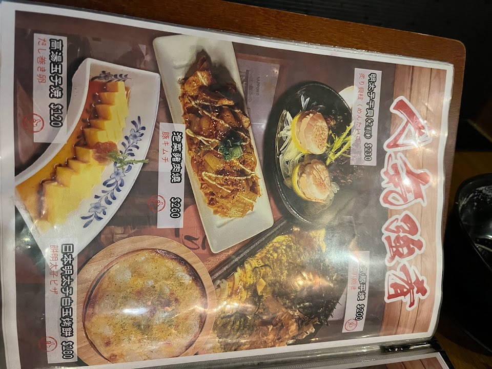 ?塩蔥豬五花2串 $130 這個不太好咬,有一點嚼勁,不喜歡很有嚼勁口感的人,不推薦,因為會咬到有一點酸。 ?高湯玉子燒 $120 ?大氣䐁平燒 $200 份量挺多的,裡面的餡料滿滿,每一口都得到餡料,大概吃了這一份就半飽了吧! ?名鷄軟骨 $160 雞軟骨必點!跟一般吃到的炸雞軟骨有一點不一樣,可能是在雞軟骨上有加哇沙米?所以不會覺得吃炸吃得很膩,而且皮也不會太厚,不會覺得吃一堆裹粉的感覺。 ?明太子山藥 $160 ?日本達摩汽水 $90 服務 內用 餐點類型 晚餐 平均每人消費金額 $400-600