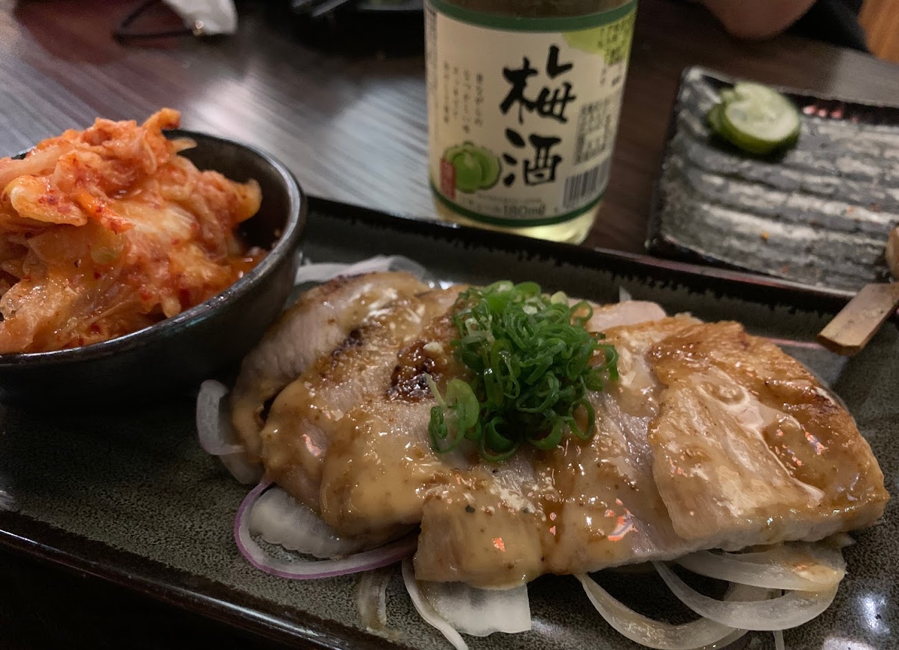 我們四個人點了玉子燒、鰻魚飯、松板豬、明太子雞肉串、烏龍麵、鯛魚燒、藏元梅酒?