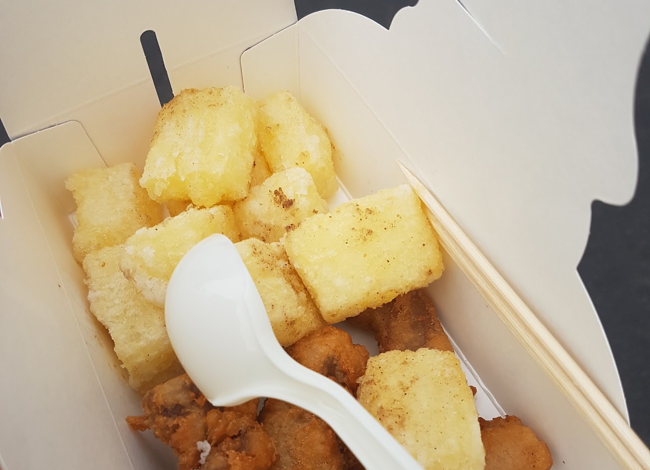 卜肉吃起來甜甜的,糕渣炸的外酥內嫩,店員說:小心燙哦!燙到痛三天哦。