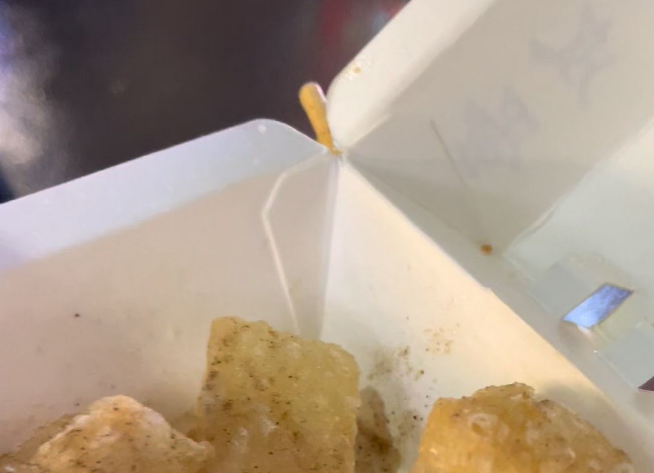 湯圓炸好沒有滴油就裝包了,全都混在一起很可惜,渣糕的口感一言難盡,這是軟的蘿蔔糕吧