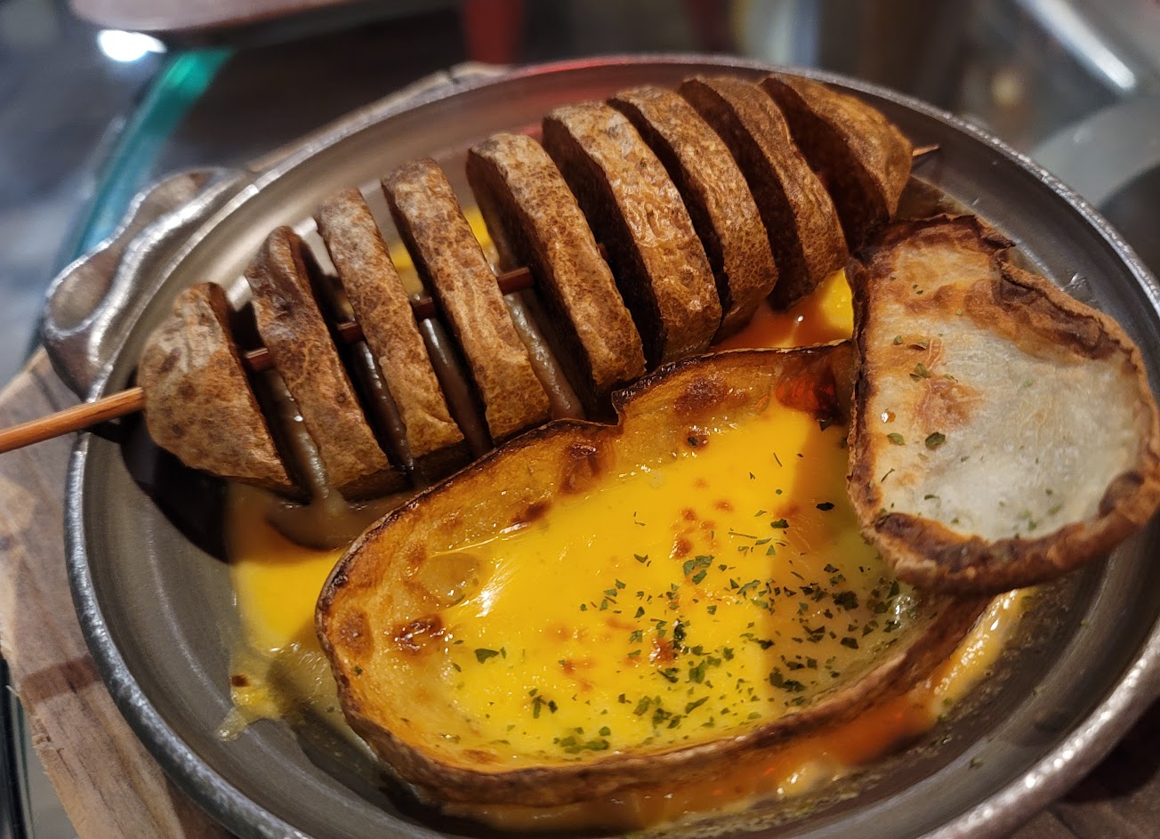 採自助式的拿取生串物、順勢拿了一顆可愛的馬鈴薯?,完全無法預期會用什麼方式烹調,上菜出現的可愛起司馬鈴薯($88)⋯濃濃的起司奶香、馬鈴薯的脆皮⋯好好吃⋯原本還以為只是一顆普通的烤馬鈴薯xd上菜時真的很驚艷!