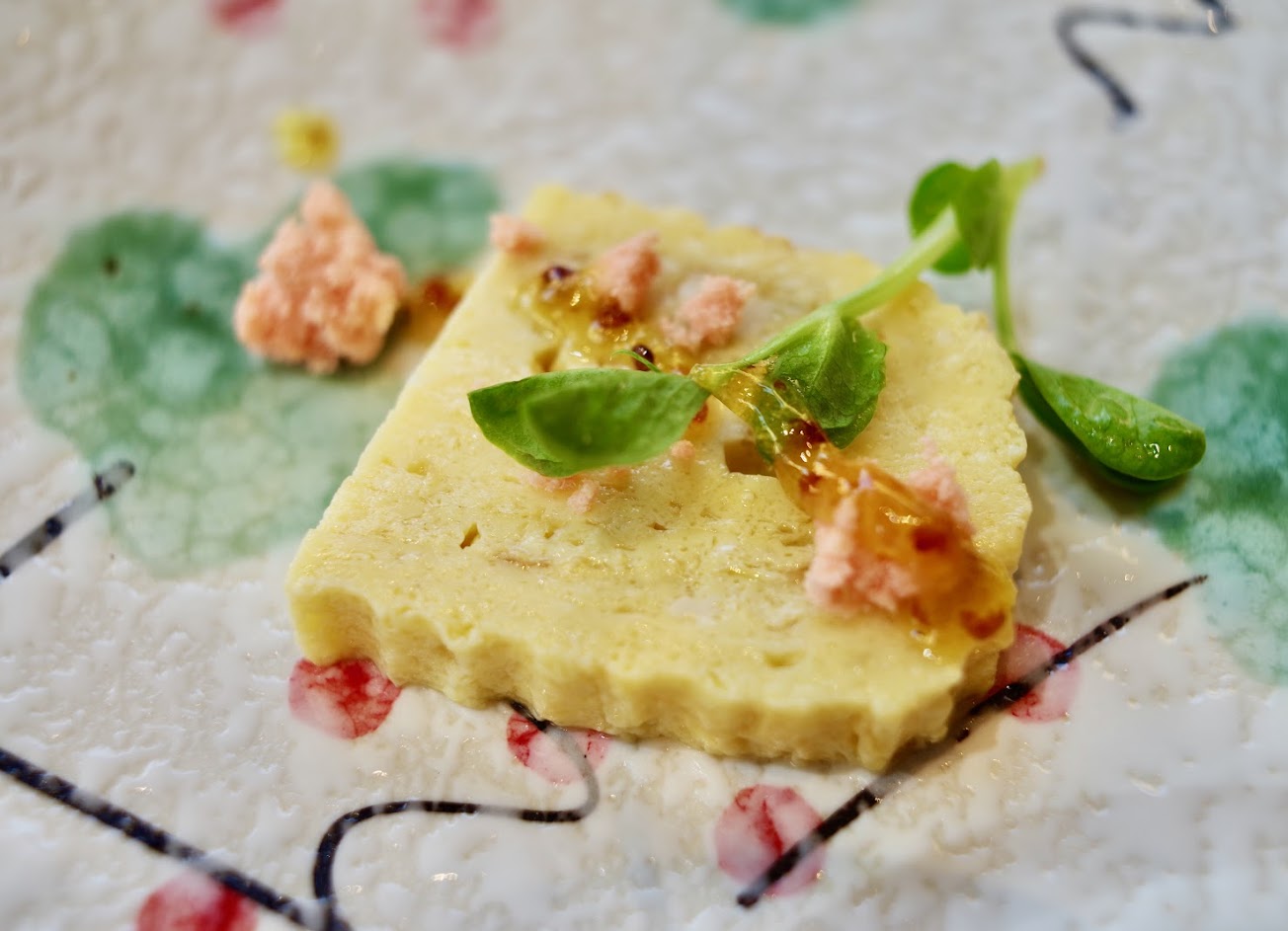 加點的比目魚壽司應該是表現最優的。原本是點安鱇魚肝炙燒比目魚緣側,但老闆說最近買不到新鮮的安鱇魚肝,改搭配德國乳酪。比目魚炙燒後的口感入口即化,魚油在口中化開,淡乳酪個人覺得和比目魚感覺不是很搭,乳酪本身的味道太搶眼了,總覺得沒辦法喝比目魚融合的很好。