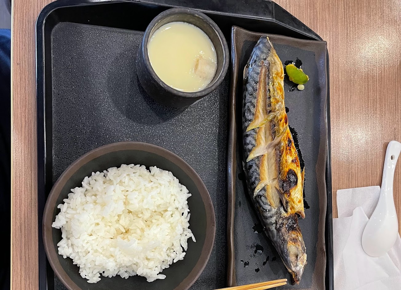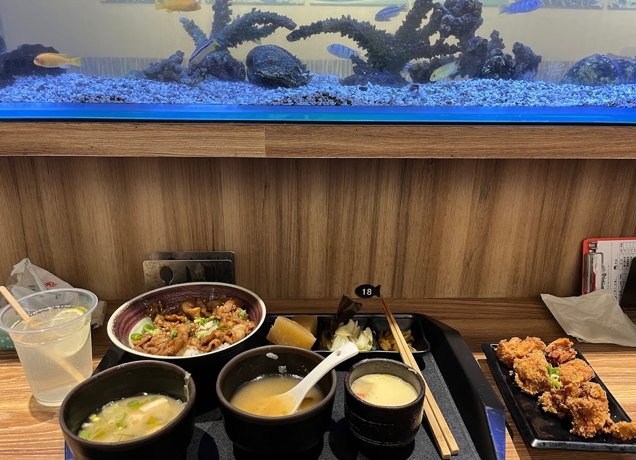 店內桌椅感覺有年代了 一整排二側吧台式座位 讓個人用餐的沒有壓力 還可以對著游來游去的魚兒用餐? 可惜是漁缸可能難照顧 就整潔美觀部份比較… 餐點飲品還可喝完再外帶很貼心 湯品還有提供粥都可無限續 都很可惜口味都還好而已 點了鯖魚一夜干 真的失望了 魚肉太腥我覺得是烤的不夠酥 鯖魚本身的油香沒有烤出來 光看外皮就覺得烤的時間不夠 結果整條魚吃起來是濕濕的口感 小菜也不好說?就別說了? 還好點了玉子炸黑輪 這個就好吃 外皮香酥裡面魚漿甜味好吃 覺得很可惜 一入門雖然桌椅店內較舊 但服務人員態度親切 主動告知飲料還可外帶走 還有店內很多的自助提供 真的是很加分的動作 但若主食部份不能加強 光靠周邊設備跟比主餐好吃加點的小菜 真的很難留住客人的胃☹️