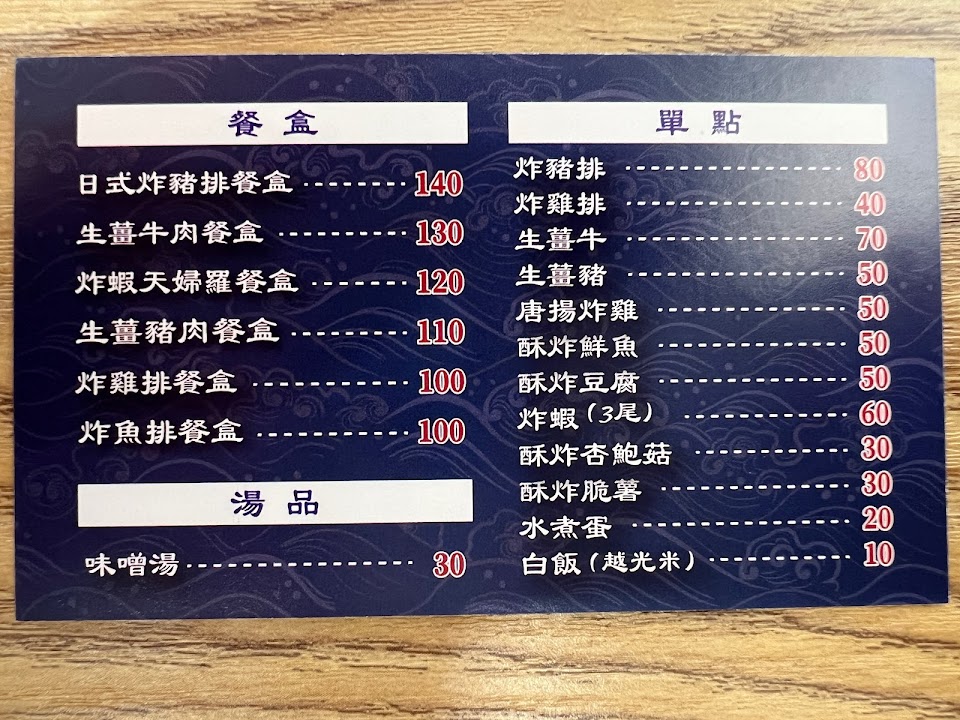 偶然路過發現一家日式便當店,既然天婦羅跟豬排是老闆與人氣推薦,就直接點了雙拼,天婦羅發揮不錯,喜歡香菇及蝦子;豬排略顯可惜,或許是想表達外酥內嫩的炸功,但偏中間的部位幾乎無法一口咬斷,略顯可惜,希望下次吃到可以進步,但整體餐點是好吃的,推推!