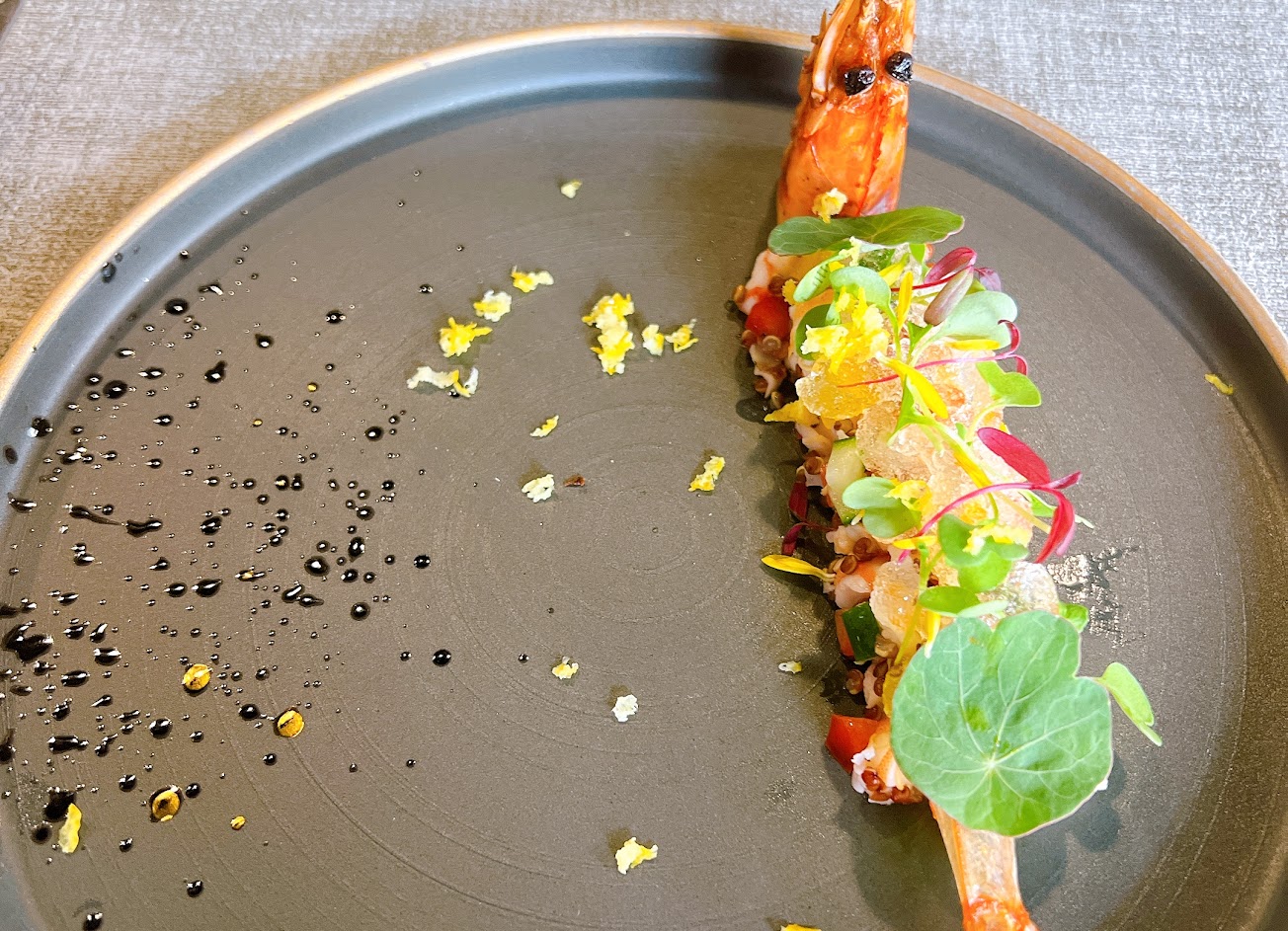 從前菜到主餐都讓人吃得滿意,餐點豐富,盤飾用心多樣,視覺效果很讚,使用了不少當地食材,各種食蔬、三星蔥、超大顆的九孔、南方小捲、飛虎魚、馬頭魚、牛小排、豬舌頭後段等等食材,每一道料理主廚都會介紹並詢問口味是否OK。