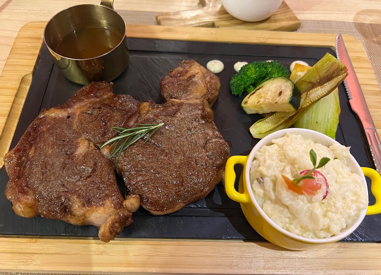 非常棒的餐廳,提供高品質的牛排料理,而且服務優質,氣氛非常舒適。被溫暖的燈光和現代風格的裝潢所吸引,整個餐廳氣氛非常舒適,讓我感到很放鬆。
